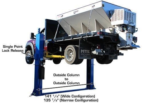 The Atlas® BP12000X is a commercial grade heavy duty 12,000 LB. capacity 2 post base plate above ground lift. This above ground lift has over sized columns, symmetric three stage arms, and single point lock release. This lift is perfect for those commercial garages that want to lift heavier vehicles but have limited ceiling height. The Atlas® BP12000X can be installed at two different width settings to accommodate wider trucks or trailers and to facilitate “driving between” the lift columns.