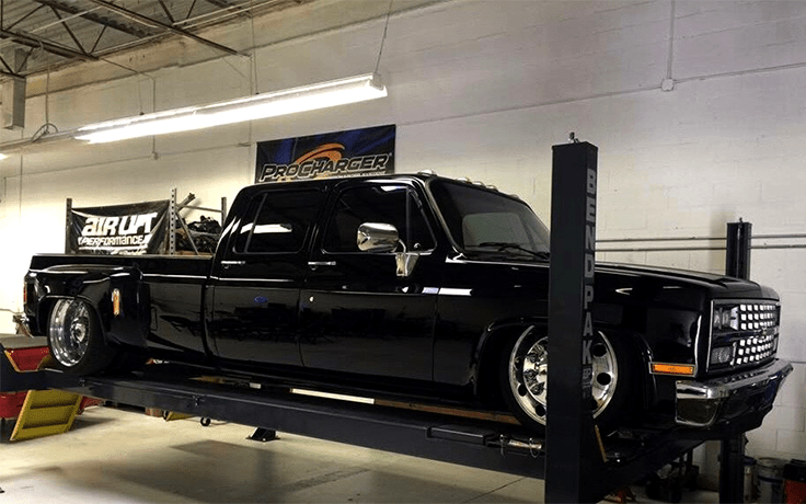 HDS-14LSX is a high-capacity alignment lift with a capacity of 14,000 lbs. It is designed for extended vehicles and includes turnplates and slip plates.